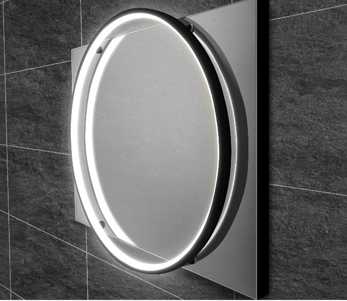Description: HIB Solas Round Illuminated Bathroom Mirror – Black With colour temperature changing and heated pad. 800 x 600mm. Can be hung portrait or landscape.