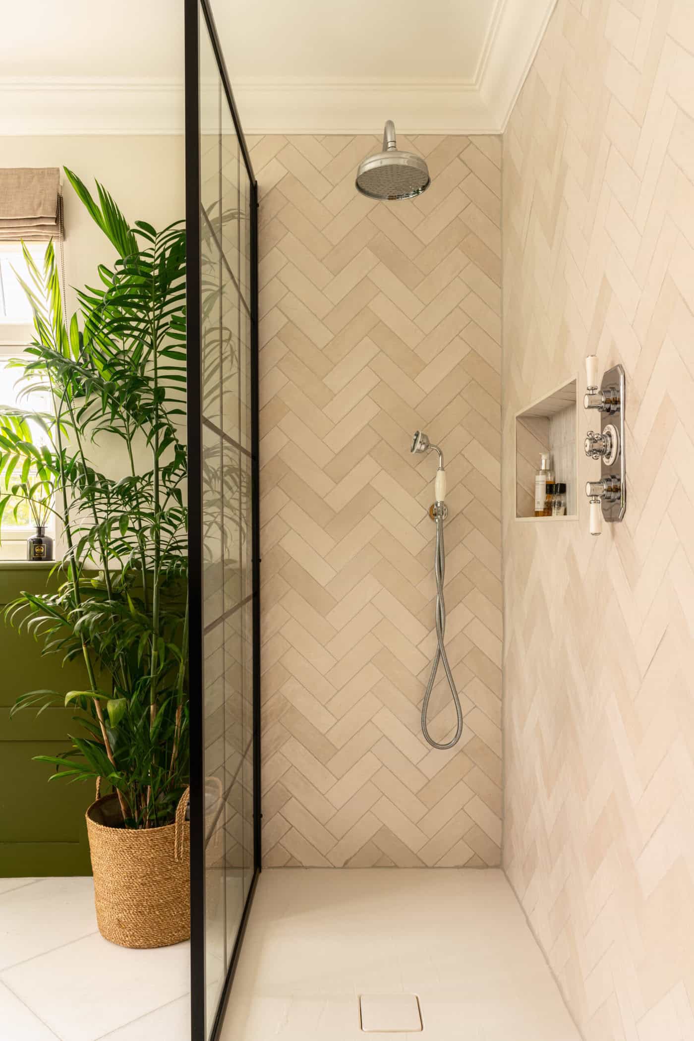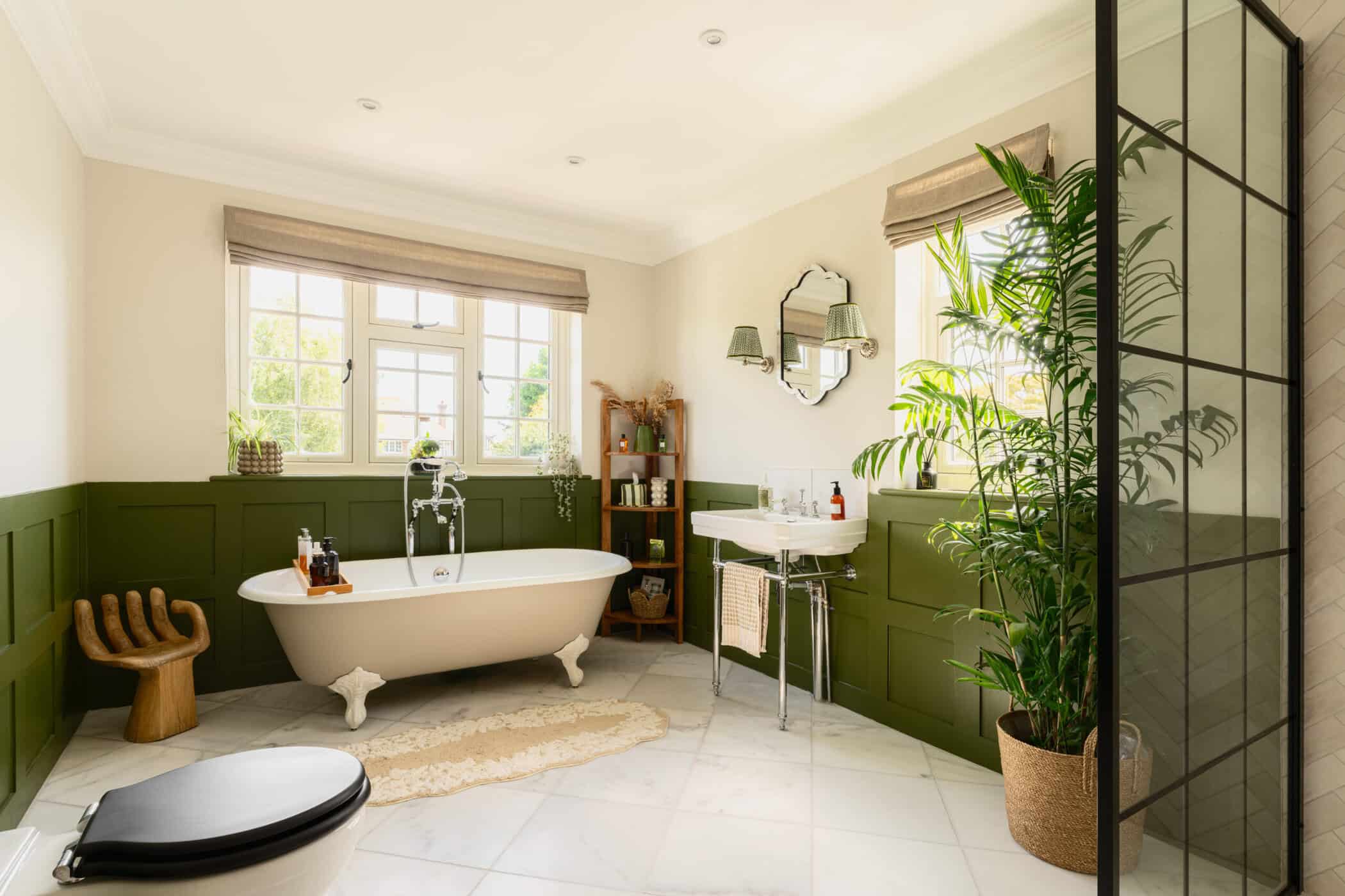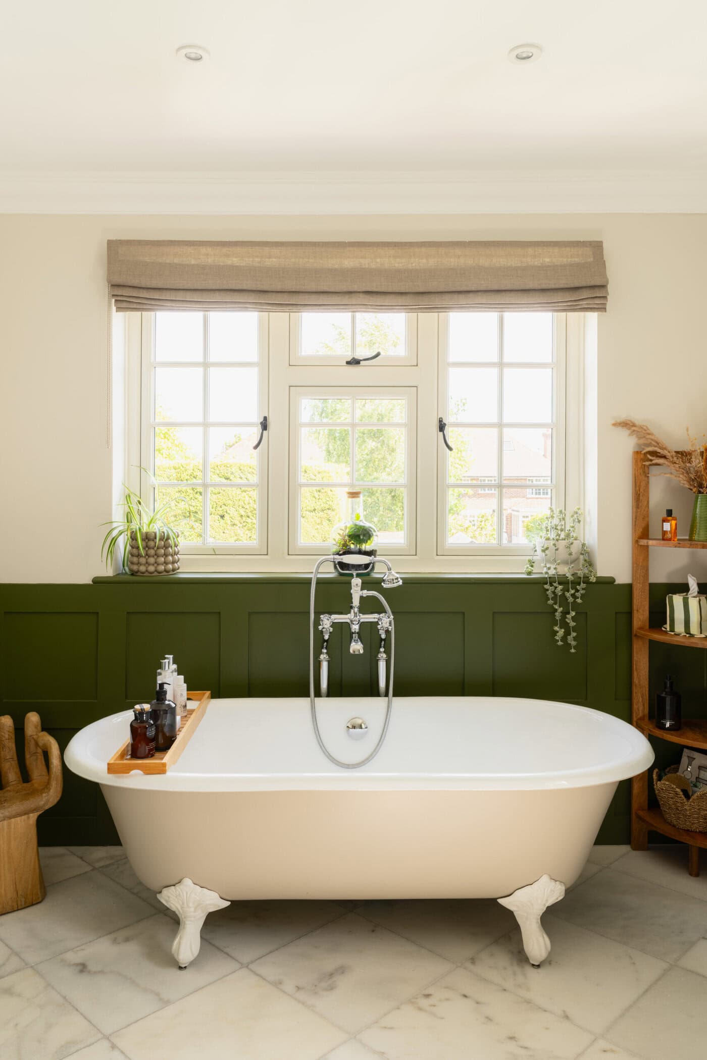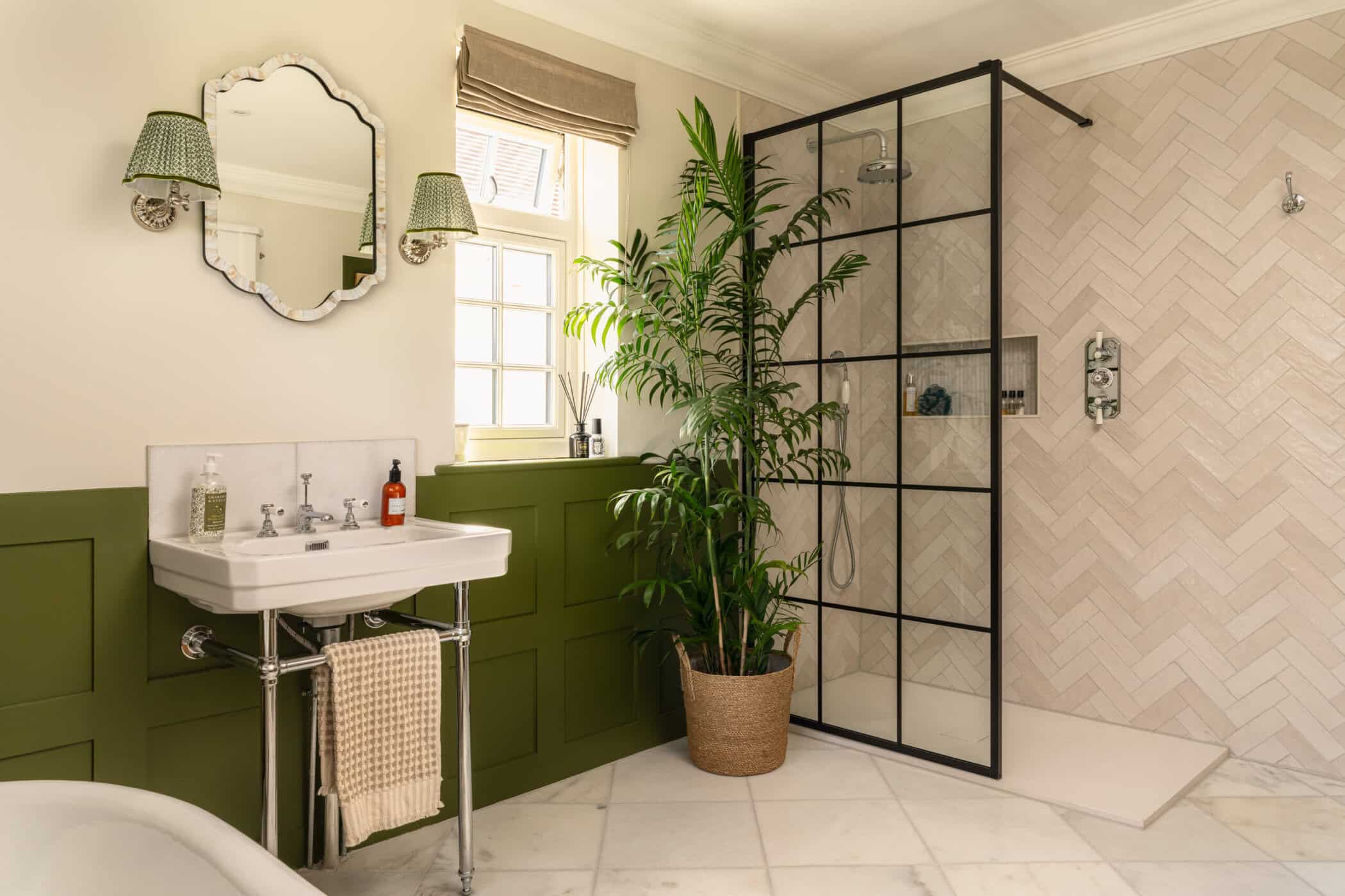This stunning bathroom was an absolute joy to design. It features classic green square paneling, a hand-painted freestanding bath with elegant claw feet, and a sleek walk-in shower framed in black crittall glass with recessed shelving.